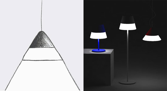 Beam系列灯具创意来自于对小时候我们如何画光的认识,小时候我们画光,不但会画出光源,而且还会努力画出光的强度,把光也当作一个物体,比如光线如果照射出来等。这个Beam系列灯具也表达除了光如何从灯罩中出来并散发开来.