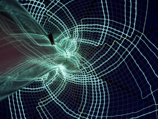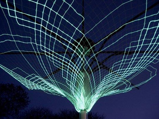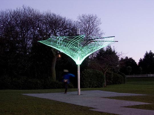 一个雨伞状的框架张开由electroluminescent(场致发光)纤维做成的伞棚,这些蔓延的发光纤维能够响应周围的活动,并在伞棚呈现出图案来。(via:dezeen)