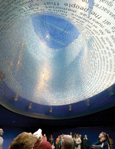 这个建成与今年春天的纪念堂修建在一个地铁站内,圆筒形延伸到地面上方,圆筒形由150,000块弯曲的玻璃砖搭建成,玻璃砖之间用一种液体丙烯酸材料粘接,并用紫外线照射固化。白天,太阳光穿过玻璃砖外墙照射到位于底下的蓝色内室,形成一种光晕;晚上,圆筒形通过底部的灯光散发出柔和的光芒映照天空。