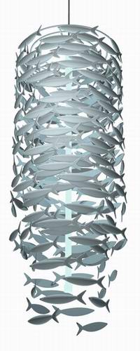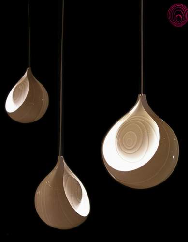 上图的 Shoal 和 Cibola Pendant light 来自Scabetti,由 Dominic Bromley 设计。Shoal(鱼群)灯启发自深海鱼群,灯的直径2米,中间有6根发光管,鱼形为陶瓷。右图为Cibola Pendant light(Cibola垂灯),由两块陶瓷片组成,圆形纹样装饰,灵感来自洋葱,反光之时能产生月蚀之美。