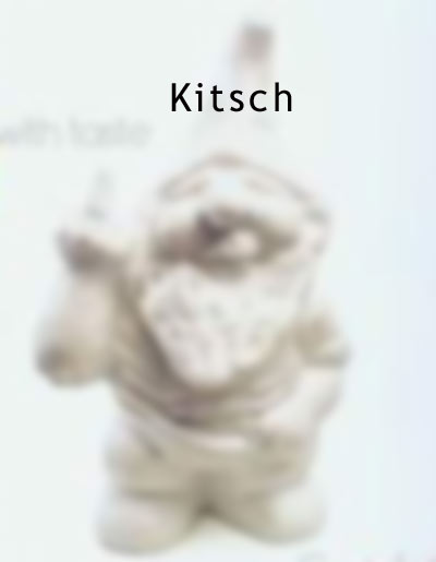 kitsch 这个词按Google的翻译是:粗俗作品[艺术品]。查Wikipedia:kitsch 是来自德语和Yiddish(依地语,一种犹太语),原意是用来归类那些对现存风格低劣拷贝的艺术品。这个词也可以泛指那些自负到庸俗的艺术,也可指那些平庸或粗糙的商品。更详细介绍见这。