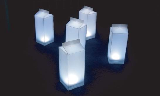 Tetra 灯和 Phantom 椅子的名字喻示着它们的创意起源,上图为Tetra 灯,透明塑料内装有蓝色 LED 灯,开关是通过挤压它的底部。Tetra 来源于 Tetrapak 包装盒,中文为利乐包装盒,瑞典著名的食品包装公司,这种四面立体包装就是来自于Tetrapak。