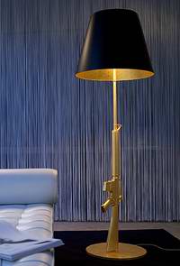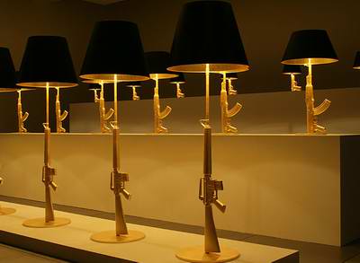 金黄的武器代表着金钱和战争之间的阴谋,Table Gun 象征着东方,Bed Side Gun 象征着欧洲,Lounge Gun象征着西方,黑暗的阴影表达着死亡,里面的十字架时刻提醒着我们对死亡者的记忆。