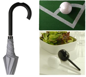 这个雨伞下面有一个往下凹的凹槽;这个地垫有一点像足球场的草地的感觉。这个是装备调味料的容器,有点像乐器中的沙捶。