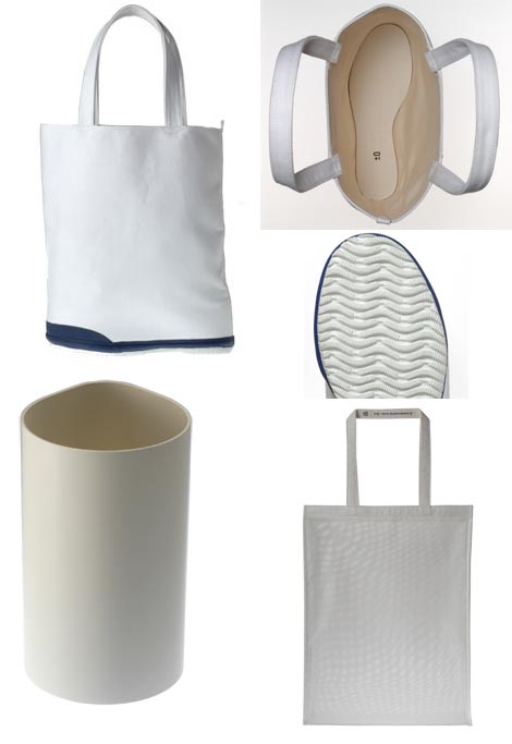这个是一个垃圾筒,有一侧面正好做得很墙角的形状一样,放在墙角很和谐。这个包的形状有点像鞋底的形状。为什么要做成这样呢?因为这个包的设计对象是针对日本的学生,他们可以在里面放鞋。在建筑工地大家都可以看到这种围的布,这个就是用这个材料做的袋子。这个材料在建筑工地随处可见,用这个材料做成这个袋的话,可以体现出一种大家看不见的一种联系。有几种颜色,有银色、绿色、白色。