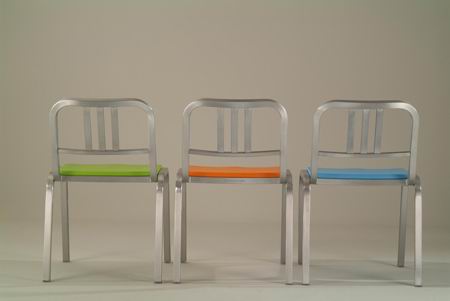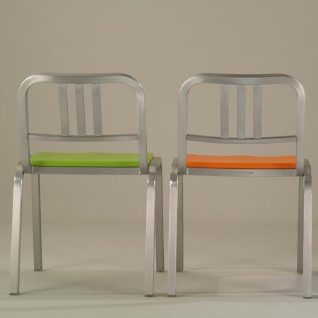 Emeco 早先都是出现在军舰、看守所、医院这种环境中,Ettore Sottsass 是第一个将 Emeco 椅子带出这种环境的设计师,在他的 Esprit 商店以及Amazon Express yacht 上,Ettore Sottsass 非常喜欢 Navy 椅子,自己家中的 Navy 椅上有橙色的垫子,所以这组 Nine-o 设计开始于此,让Navy 椅更舒适更多彩,色彩是 Ettore Sottsass 的一个特色。(Emeco Nine-0售价从$385到$1595)