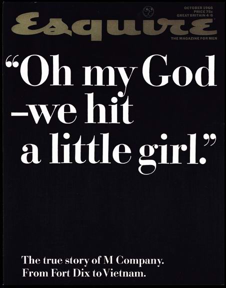 John Sack 的3万3千字的封面文章,也是目前 Esquire 最长文章的记录,文章改变了大众对越战的看法(1966年,当时指控战争罪恶还是很早),并且成为New Journalism (新新闻学)的一个标志。当时 John Sack 在随军采访中看到一位美国士兵发现一具越南儿童尸体的反应,George Lois 就用这名士兵的话“Oh my God,we hit a little girl.”来作为封面,没有照片,没有刊头,只有黑底白字,“让每一个字都有一千张照片的力量”。