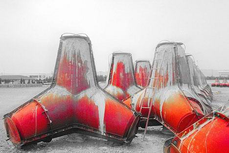 超过一半的日本海岸线都用这些四脚水泥柱或其他形状的水泥块来作修正,防止海水侵蚀腐蚀,虽然人们评价不一,从财政到环境到安全,但是从图片上看,你可以体会到“多就是美”,Flickr上有很多这些 Tetrapod(四脚虫)海滩的照片(上图地址),点此查看。 图片地址 图片地址 图片地址 图片地址 图片地址 (via:core77 & Pink Tentacle)