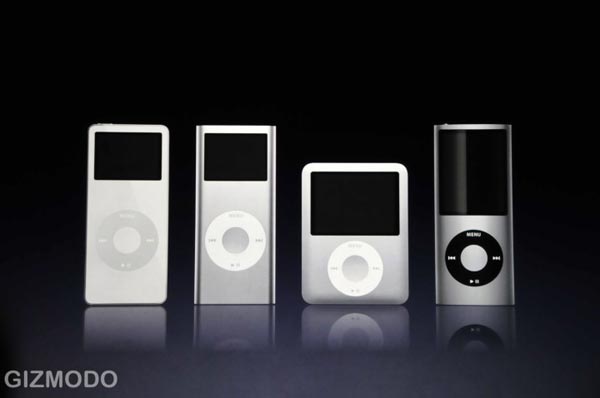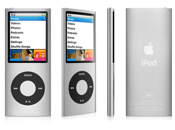 新款 iPod nano 和泄漏的谍照一样,重新恢复了 iPod nano 的苗条身材,从3:4(52.3×69.8×6.5 mm)回到了5:12(38.7×90.7×6.2mm),重量36.8克。采用了扁形椭圆的拉铝外壳,屏幕还是和第三代 iPod nano 一样大(2英寸,320×240),完整的曲线过渡让第四代 iPod nano 看上去非常薄,加上弧形玻璃使显示屏的外框变的更加窄,事实上也是最薄的 iPod,只有6.2毫米厚,如果不薄,如此外形就激发不起感觉。新款 iPod nano 增加了一些实用的功能,可以外接麦克录音,同时也将 iPhone 和 iPod Touch 上的传感器引入 iPod nano 中,当将 iPod nano 横置时出现 Cover Flow,以及“ shaken to shuffle”,晃动随机播放,比起按键操作来更符合 shuffle 的使用习惯。增强的UI配合 Apple 新推出的 Genius 功能,即类似 Pandora 等在线音乐的智能匹配功能。新款 iPod nano 支撑的音乐播放时间为24小时,视频播放时间为4小时,8GB的149美元,16GB的199美元。另外更多亮丽的颜色。