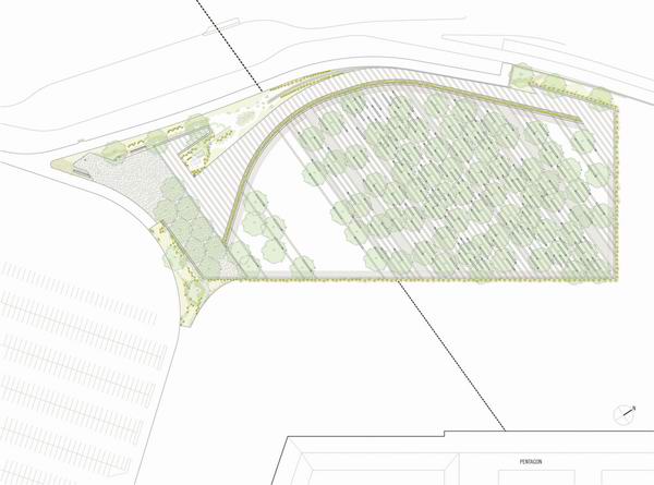Pentagon Memorial(五角大楼纪念地)由 KBAS Studio 设计,KBAS Studio 与遇难的家庭紧密合作,纪念地从2006年7月15号开始建设,今天即美国时间2008年9月11号投入使用并向公众开放。为纪念这184位遇难者,184条能被照亮的长凳,按照年龄(从3岁到71岁)在1.93英亩(7800平方米)的场地上依次排开,每一条长凳上雕刻有遇难者的名字,五角大楼内遇难者的名字经过排列,当人们阅读这些名字的时候,面对的是五角大楼的南面即撞击事件的发生地,飞机上的遇难者的名字经过排列,当人们阅读这些名字的时候,面对的是飞机撞击前的天空,纪念地上种植有大约80棵的血皮枫。