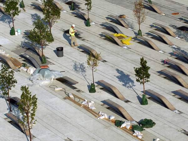 每一个纪念单元的长凳,通过CNC制作的木模,然后用不锈钢铸造而成,名字雕刻在悬臂的末端,悬臂下是一条流淌的小河,当夜晚时它会会发出寂静的光芒。场地上的砂石地让人们可以听见彼此的脚步声,同时也让种植的树木不需要其他保护栅栏而自然生长,在将来它们会提供遮阴地,同时它们掉落的树皮将见证着时间的流逝。