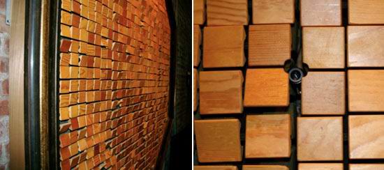 Wooden Mirror (木头做的镜子) 来自交互设计师 Daniel Rozin 的作品,这面镜子由830块小方木做成,这些木头表面本身当然是不反射的,但是事实它却能和镜子一样反射环境,因为这830块木头里面藏着摄像头,能够获知周围的光线变化然后操作每块木头背后的电机,来模拟获取的图像,下面有视频。