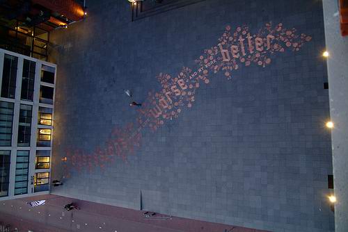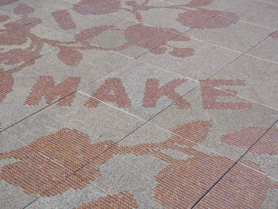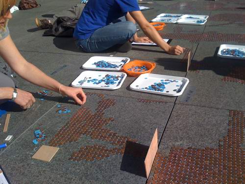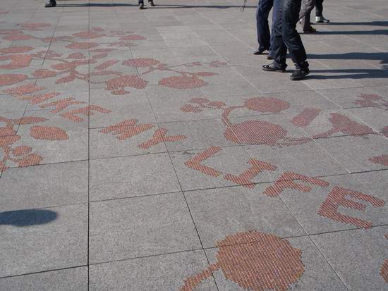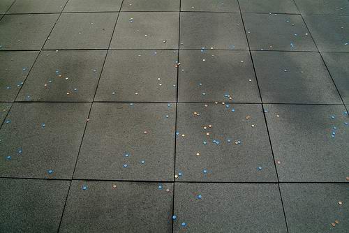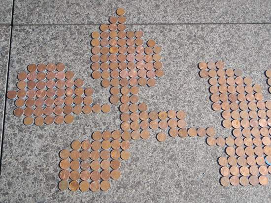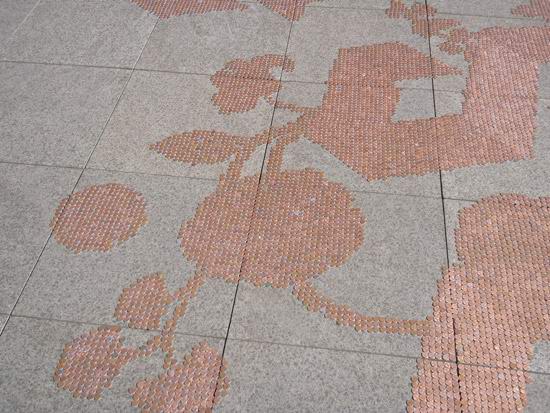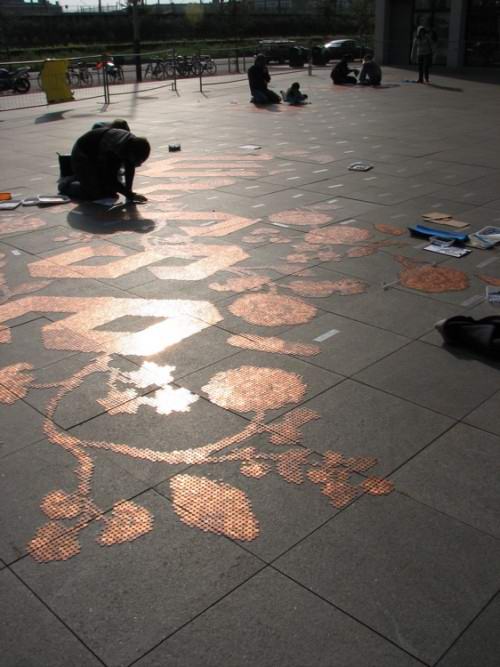 上图场地中亮丽的花纹可不是大理石铺成,而是25万欧元的硬币铺成的,这些金钱就这样赤裸裸的撒在这个20×40米的场地上。这个作品来自 Sagmeister,题目叫做“Obsessions make my life worse and my work better ”——我的作品更好我的生活就更穷的困惑,这句话也是图案的一部分。