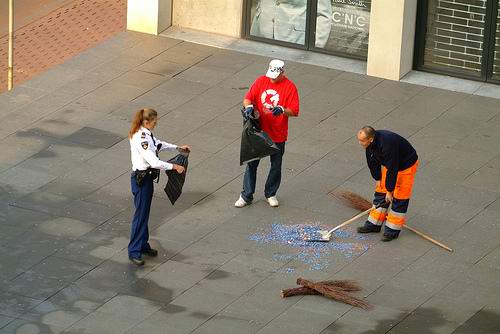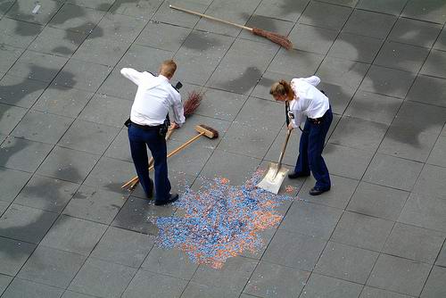Sagmeister 的这个作品是 droog 组织的 Urban Play 的一部分,Sagmeister 用了一周的时间完成这个作品后,第二天去场地看的时候,25万欧元一个子不剩的不见了。原来是有一个拿着塑料袋的人在早晨在捡这些硬币,邻居看到并认为是“偷”,然后报警,警察认为他们无力保护然后就清场。