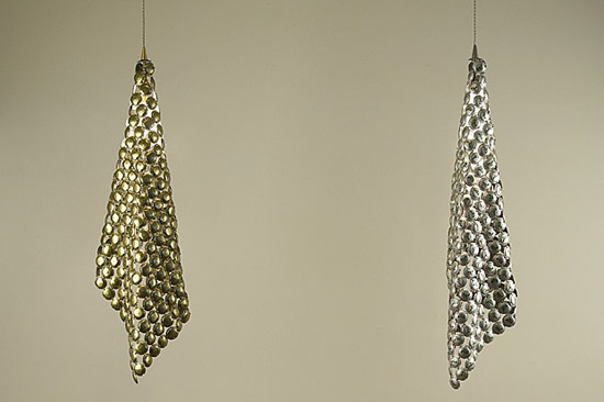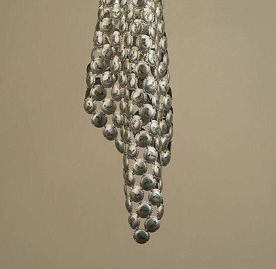 这幅图的吊灯的灯罩是用瓶盖做成的,来自以色列的 Yoav Kotik,在一定距离看上去很漂亮,我原以为是镶嵌在透明基料上的,如同布一样。Yoav Kotik 还用瓶盖做成了其他东西,详细可见这。