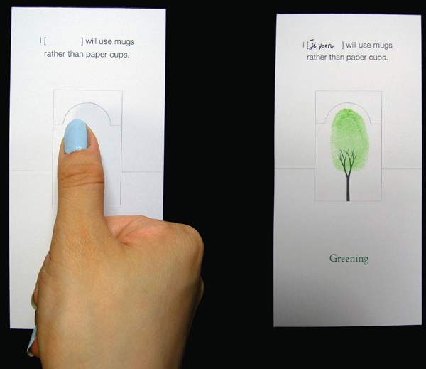 这是designboom举办的green earth设计比赛的一等奖获奖作品,来自韩国 ji yoon Yang 的 greening (pop-up card),这一组可折立的卡片上方写有一些承诺语句,比如“[ ]使用水杯而不是用一次性纸杯”,“[ ]尽可能搭乘公交车”等等致力于环境保护和绿色地球的行动语句,这些空格内是让人们填充自己的名字,而在这些语句下面是保证承诺的地方,即摁上指纹,在摁上指纹之后,一颗郁郁葱葱的绿树就出现在面前。