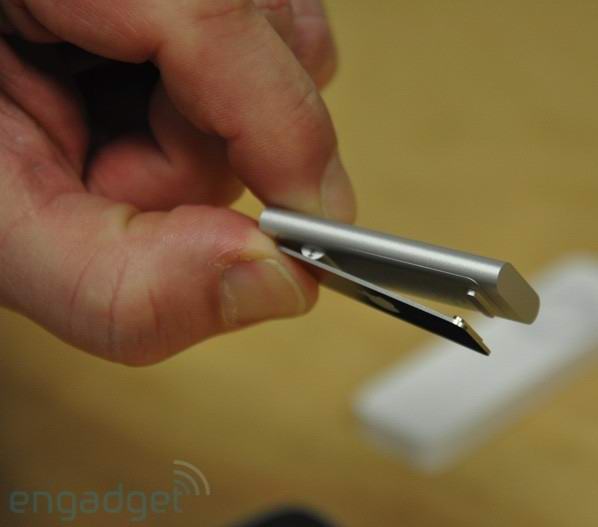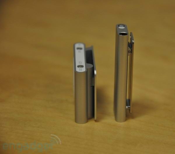 而这个第三代 iPod Shuffle,比起第二代 iPod Shuffle 更加简洁,没有了控制键,更加紧凑,精致且极简,比如夹子部分的变化,就可以立即感受到,最主要的这个 iPod Shuffle 看上去是全封闭的,两端都没有开口,就像一块完整的金属(下面有图),背面分件的配合线也很漂亮,非常纤细。简洁但非常不简单,这种不简单并不是工艺真的很前沿,而是追求。或许我们可以讨论一下它的加工工艺,是铝挤还是其他,如何封闭两端,如何装配,如何拆解等等。本来这个产品想等到 ifixit 拆解之后再发,但在Engadget 上看到实物照片,特别是看到完整的样子,如同“听见芝麻糊的叫卖声——我就再也坐不住了”。其实信息我们网站右侧也早发了,我们网站右侧栏每天都有丰富的内容更新(都是可点击的),如果想订阅这些内容,地址在这个页面下面,更多则在iDESIGN上,欢迎参与分享。更新:ifixit已经将 iPod Shuffle拆解。