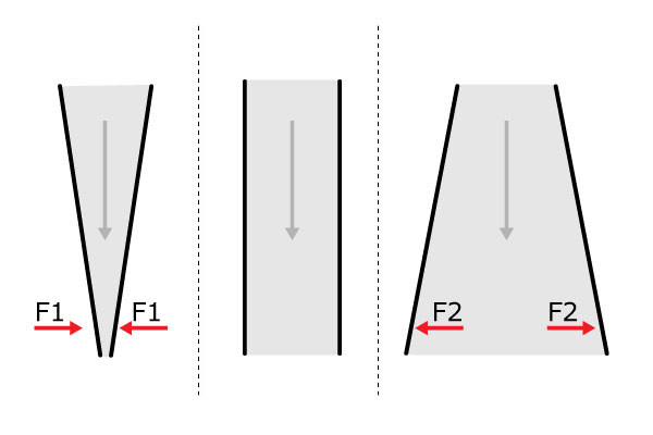 如要用“纵深”来代替“深度”,就可以避免一些因语言给主观第一印象带来干扰。所谓设计的纵深度,就是一个设计带来一种路程感,在空间和时间上能够形成一段距离,因为“设计”从一般意义上来说不是像“标准件”这样的东西,无论好和坏,都有一定的纵深度。而纵深度的区别就像上图说排列的一样,有的走向狭隘,如一个倒三角或者倒梯台,有的如举行保持一定的距离,而有的如梯台一样可以不断扩展,既表示着纵深度的广度,也能预示着纵深度的走向。