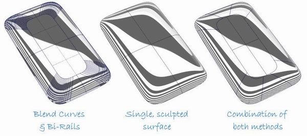 这个教程通过了一个中间形体细节不符合设计但视觉符合设计的中间模型去达到最终的形体和视觉都符合设计的结果,比如上图的三个表面,第一个是快速但不追求质量的方法,我们可以看到四个圆角上密密麻麻的span线,中间使用单轨扫描而成,但它的集合尺寸并不符合设计,比如说和前壳会配不上,而这个教程就是通过分析这个视觉上符合结果的曲率变化分布来决定最后的建模方法,最后取得准确美观的结果。从这个教程中我们可以了解,如果在建模开始前有详细周到的分析,可以很快达到最后的结果,比如意思到上图四周的曲率是从中间的平面之间的何处开始加速,怎样的速度加速变化。建模过程中也有小技巧,比如我们追求的准确永远是符合公差范围内的准确,那么我们就可以在公差范围内作一些调整,比如四个圆角不一定要是100%的R多少过渡,我们可以用高阶的自由曲线去拟合这个R角,因为现实中也是,未必一定要准确的R角过渡,只要在公差范围内就是符合要求的,这一点我们可以从 AliasDesign 另一个教程中可以看到—— Devilin the Details 。