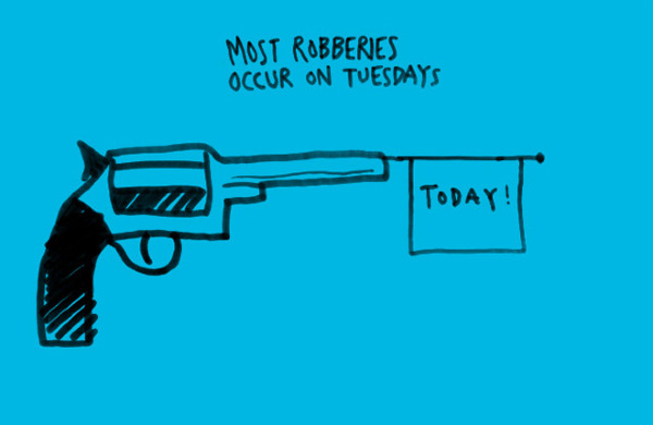 每一天学些东西(LEARN SOMETHING EVERY DAY)是一个非常不错的插画blog,每天用优秀的插画告诉你一些新知,比如上图说多数抢劫案发生在星期二,小心行事。
