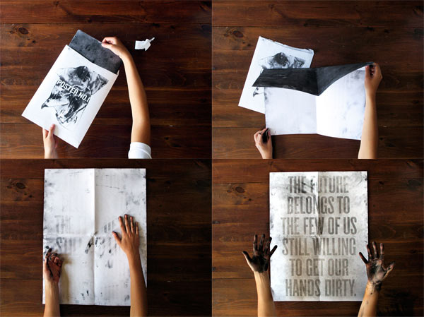 来自 ROLAND REINER TIANGCO,一半的任务由收到海报的人完成,而且会弄脏双手。海报显现,上书“THE FUTURE BELONGS TO THE FEW OF US STILL WILLING TO GET OUR HANDS DIRTY.”(未来属于我们中那些仍然愿意弄脏双手的少数分子),我喜欢这句话。