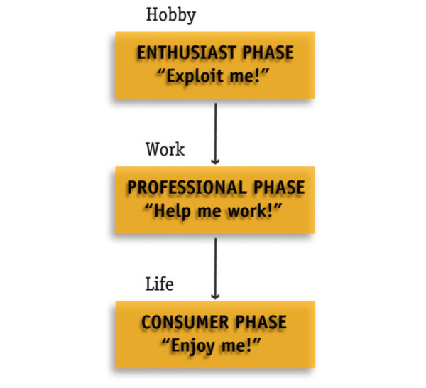 比如说手机,现在对它的认识与五年前已经相差很大了,五年前它是一种工具,而现在虽然它依然是一种工具(相对于人来说),但是它承载了更多的内容,是它的工具特性退隐到幕后,这就是一个从专业者阶段朝消费者阶段发展的过程。同样可以推出的是,当一项技术进入消费者阶段的时候,并不是热衷者阶段和专业者阶段就不存在了,只不过是细分了而不是作为主要群体特征了,一个新技术产品推向市场,在“消费者”作为一个大的客户群体外,同样存在着“热衷者”型消费群体以及 “专业者”型消费群体,甚至在同一人身上,这三个阶段的接受过程也依然清晰。