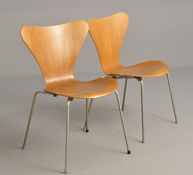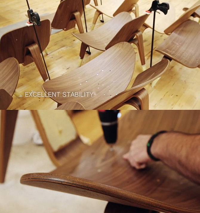 要说胶合板椅子当然不能少 Arne Jacobsen 1955 年的 Series 7,上两图来自这,这条椅子的廉价复制品很多,但是这些复制品基本在腰上一踩就断,而来自 FRITZ HANSEN 可以踩上去跳动,详细见这视频。复制品另外一个不同的地方,就是腿与椅子结合的结构,大多数偷懒直接用螺丝一穿。而 Series 7 的螺丝固定是在那个罩壳内的,而脚上四个是支撑垫。这个视频有制造过程介绍。