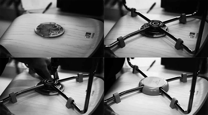 通过这个视频可以看到首先是底盘与椅面胶合板的安装,然后是椅腿组件与底盘的安装,并不是直接用螺丝连接的。
