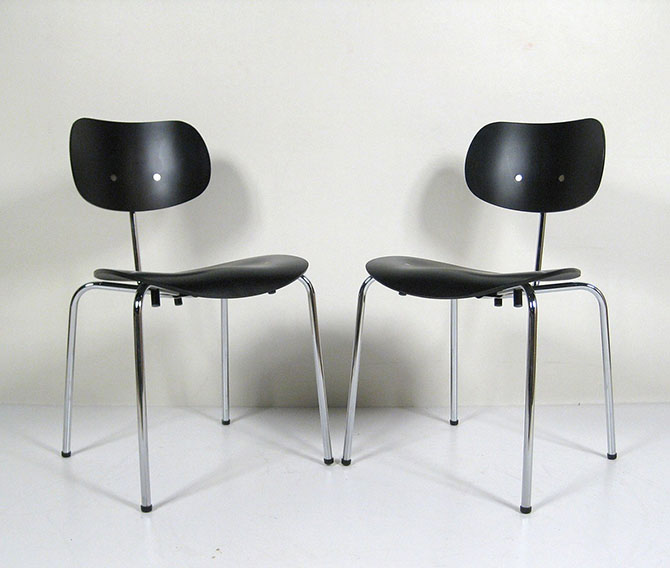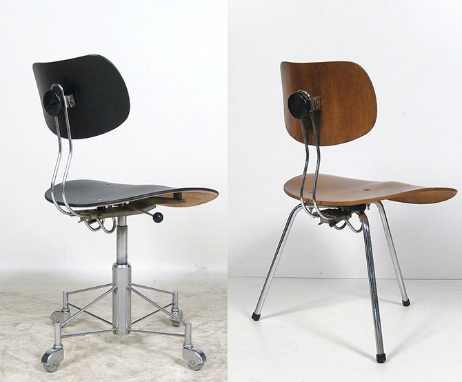 Egon Eiermann 的设计在结构上与 Eames 不同在于贯穿了胶合板,使用了螺栓结构,并且将正面的金属连接件表面处理,使其与一面一体,在椅面上可以看到几个光亮的连接点,将包含的一丝“破坏”转化为坦白的结构及形态特征。
