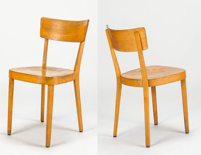 Frankfurter Stuhl,法兰克福椅,1936 年。它有一些略微不同的版本,上图来自这,稍稍不同的版本可以见这,主要是椅面前端稍不一样。这条椅子的结构也很清晰,可以通过这个来辅助理解。为制造简单,弯曲部分座圈成为一个前端开口的 U 形了,并且连接的螺丝和螺栓明显可见,椅子前腿部分与传统的白话设计差不多,上图所示在椅子前端增加了一块有点弧形的挡板,为了舒适性的考虑,从这可以看出这个舒适性是后补的,也就是说它的出发点是批量生产。