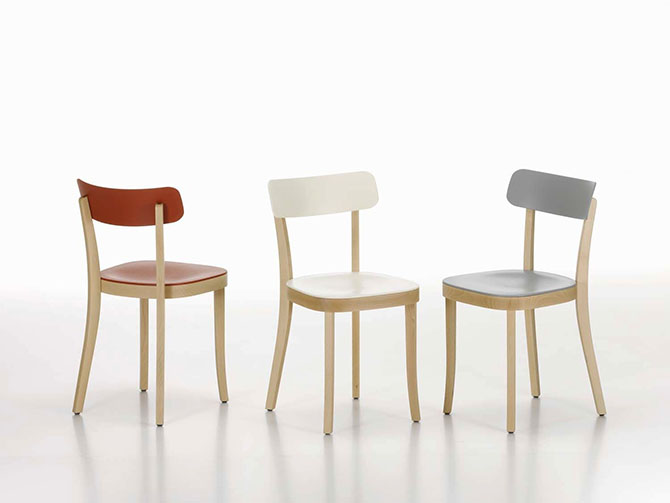 Jasper Morrison 2008 年的 Basel 椅子,Jasper Morrison 明确指出是对一个 100 多年的椅子类型的再思考,在这个网页也有提到,Jasper Morrison 在座位和靠背上使用了塑料,那么靠背的结构就需要和木头不一样了,见此。