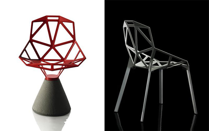 Chair_One 是 Konstantin Grcic 除 MayDay 之外另一个著名设计,因为这条椅子的盗版现在到处都是,所以人们已经很熟悉了。它的主要特点在于结合了铸铝工艺,通过多边形的表现,让它很快成为一个 Icon,跟历史上那些经典椅子一样。Chair_One 的引爆时间实在 Herzog & de Meuron 的 De Young 博物馆的竣工宣传照上,当时户外一堆 Chair_One,很多建筑师和设计师看到照片后都在查这条椅子是什么。