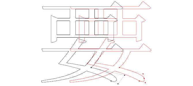 字体在实际场景中的使用,会有不少坑坑洼洼等着设计师去踩。如上图所示的黑红两色的“要”字轮廓,都是使用思源宋体,只不过是在不同设计软件环境中使用,黑色是在 Adobe Illustrator 中使用思源宋体,而红色字是在 Rhino 中使用思源宋体(曲线输入)。黑红两个字,大体上看相差不大,但是如果放大去比较长点的尾部的形态,会发现 Rhino 中的字形明显发生了偏离,如果来对比两者的曲线结构,也能发现两者是不一样的。