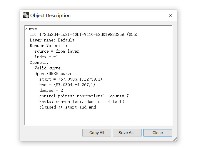 Object Description 窗口中信息并不复杂,比如曲线的属性,最主要就是阶次是多少,控制点是有理还是非有理的,节点是非均匀还是均匀的,其实就是来自于 NURBS 的基本概念,非均匀有理 B 样条,非均匀涵盖了均匀(即均匀是非均匀的一种特殊形态),有理涵盖了非有理(即非有理是有理的一种特殊形态)。而在我们使用多种工具来塑造形态,或者经过导入导出的过程,如果不加注意,曲线或曲面就有可能在阶次、均匀与否和有理与否上发生变化,就给编辑可能带来一些不可描述的问题。比如有理曲线的控制点可以有不同的权重,拉动一个控制点和拉动邻近的控制点对曲线带来的形态变化就不一样,而不像非有理曲线那样每个控制点的权重一样,而控制点怎么去影响曲线就和节点是否均匀有关了,有时碰到曲线变成了非均匀,可能带来编辑结果的不可预知或者复杂性。