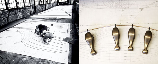 传统的样条曲线的绘制以及放样,无论是用于实际尺寸的模板制作,还是缩小的图纸绘制,都是模拟的、类比的、平移式的,一条直线或一条曲线的绘制都是沿着尺子或者木条的边缘画出的,而到了计算机辅助设计的时代,比例不再成为图纸绘制的约束,从小屏幕上的图纸到最终物品的尺寸,从实际物品的尺寸回到小尺寸的图纸,这种放大和缩小接近无损的。