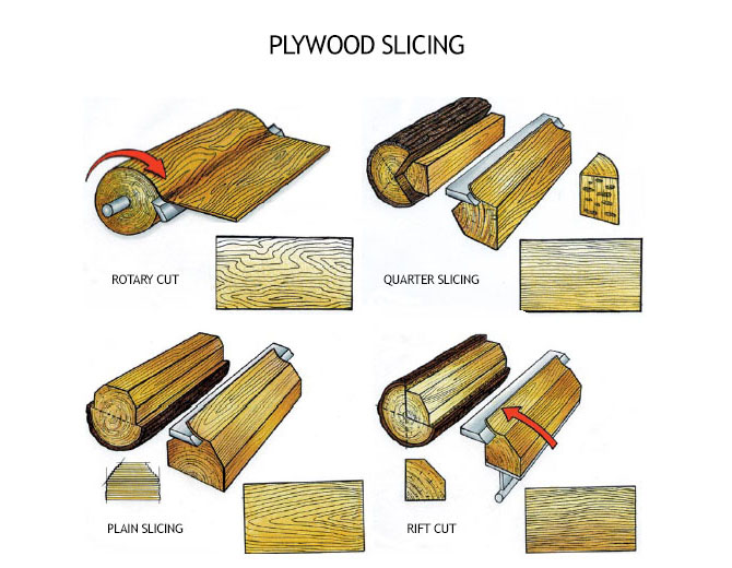 合成板(Polywood)的是将一层层薄木片叠加层压而成,而这些木片是从树干上剥落而下,合成板木皮也有不同的切削方式,如上图所示(图片来自这),不同的切削方式带来不同的木纹,最常见的是旋转式(上图左上)带来的木纹将会是连续的,经常使用在对木纹有要求的表层上,这种加工方式可以见这个视频。