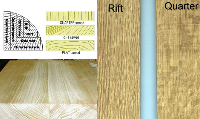 Rift Sawn 是经常与 Quater Sawn 混淆不清,有人翻译成径切,认为是验证半径方向上的切割,事实上不是,除了 Core77 外,A Riving Home 作者对这个词也作了一些考证。通常会认为木纹线与板面形成的夹角在 30 度到 60 度之间的称为 Rift Sawn,Rift Sawn 是介于 Plain Sawn 和 Quater Sawn 之间,它可以看作是生产 Quater Sawn 木板带来的副产品(剩余料),价格相对于 Quater Sawn 更廉价,而且花纹也会介于两者之间。