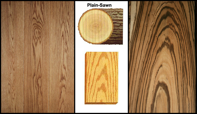 Plain Sawn 即弦切是最直接的木材切割方法(上图来自于 Core77),沿着树干轴向方向依次平行切割而成,最具生产率,最不产生废弃料的方式,所以它是最为常用的切割方式,如果不是特殊需求要用到 Quarter Sawn 的话。使用弦切法年轮与板面形成的夹角是在 0 到 30 度(中间一块例外,等同与 Quarter Sawn),因为年轮并非是纯正的同心圆,而树干绝非可能完全笔直,所以弦切法就会在板面上形成拱形花纹(通常我们会称为木纹),比如切割到与年轮线类似相切位置,在板面上年轮线相连就形成了拱形。弦切法的一个缺点是由于得到的木板的纹理结构不够均匀,容易受环境的干湿影响,容易形变,另外一个缺点是当不需要这些拱形花纹,以及弦切容易暴露的一些树木瑕疵纹时。