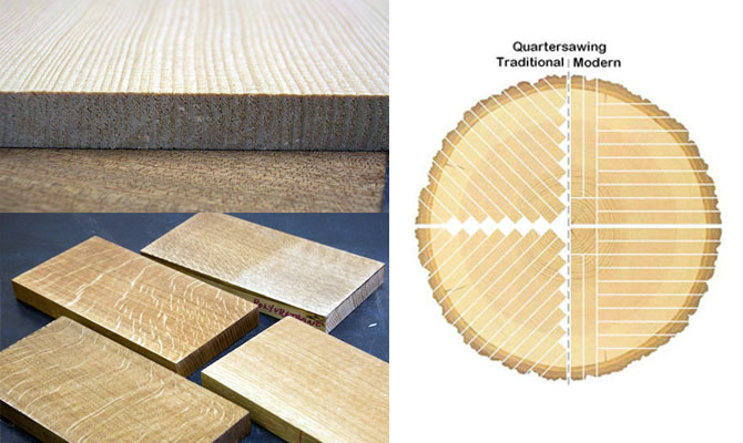 Quater Sawn 即四分切亦叫刻切(上图来自 Core77 和这),顾名思义就是现将木头切成四等分,然后再切割成木板。真正意义上的 Quater Sawn 是垂直于年轮的方向去切割,这样在端面木纹的线条接近竖线条,当然如果以这样的要求去切割木头,一段木头上只能获取几块。通常会木纹线与板面形成的夹角在 60 度到 90 度之间的都称为 Quater Sawn,Quater Sawn 比较浪费材料,容易产生小块的木板,所以 Quater Sawn 在实际应用中有不同的方式,比如上图所示的传统式和现代式,这个 Youtube 视频演示了常见的 Quater Sawn 加工方式。Quater Sawn 加工的木板最大的优点就是稳定性,不宜变形(所以乐器上通常使用这种方式加工的木板),另外就是纹路的形态,比如适合于使用在桌子和椅子的腿上。Quater Sawn 还能带来虎斑纹(Ray fleck),上图所示的白斑,具有独特的易识别的特征。