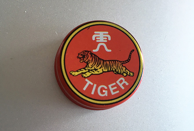 像虎标万金油这样的东西总是放在抽屉或某个盒子的角落,偶尔用到时才会去翻找,但如果某个时候,稍加注意力,拿起来端详一下时,发现这个 4g 装的小铁盒非常漂亮,翻过来一看,背面的“TIGER”字体还是 Helvetica!