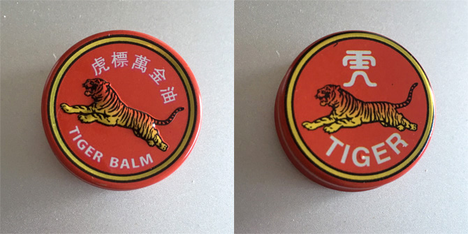 在网上搜索一下以前的这个圆形小铁盒装的虎标万金油,虽然在一些细节上有更新,但是总体的设计上都没太大变化。如果去比较虎标其他产品的设计,就会发现这个小铁盒就像一个小小的异类一样,与那些南洋式的设计风格明显迥异。直接简单,高识别性。正反两只老虎,与旧时代的品牌一样,就是源自于识别的品牌,除了和创始人姓名有关外,和产品并没有关系,而且它是否有内涵或者象征意义变得无足轻重,只是通俗易懂老少皆宜的识别性。正面的老虎作了击凸,而是凸起形态是立体的(老早的盒子凸起是整个平面),因为老虎凸起,所以老虎周围的正面整体是向下凹的,四周的唇边就高起与凸起的老虎平齐,可以让盒子平放而且还能放置磨损。背面是整个平面,通过汉字和商品名称,形成了正反面之差。小铁盒的颜色就只有红黄黑白四色,黄黑形成的圆环非常醒目,设计上的点睛之笔。