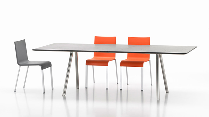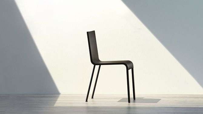 比利时设计师 Maarten Van Severen 1998 年为 Vitra 设计的 .03 椅子就是极简的风格,就像是画一条椅子的轮廓谁都会画出的那种,侧面轮廓就是两条线。.03 有两种款式,可累叠和不可累叠两种,区别在于两条后腿略有差别,而从椅子总的形式上来看,就是一个一体式的椅身,以及四条腿。前腿的形态与椅身是连续的,而后腿是独立的圆柱形,形成的侧面轮廓刚好是两条线。椅背有一个内凹的弧度,看起来它并非是一板一眼式的极简风格的设计,否则它的椅背就可能是平直的了。椅面前端向下延伸倒是让它具有了一些特点,但是仅仅是样式的说服力是不够的,.03 椅子看上去就是一条极简式设计的椅子。
