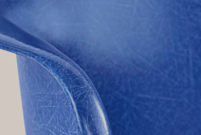 [ 3 ] Fiberglass(或 Fiber-reinforced plastic,FRP),玻璃纤维增强塑料,俗称的玻璃钢,现在通常只用在工程产品上了,除了一些特殊需求外,很少会在日常用品中出现,因为无论从品质还是生产上都比不上热塑性塑料。但是玻璃钢也有独特的材质表现力,上图来自文章 Doing Quality: A modest proposal for honoring Eames,里面还有 Eames 其他产品的一些细节图片,Eames 为玻璃钢椅子排过一部非常出色的短片(Youtube)。Eames 这一系列玻璃钢椅子由 Herman Miller 和 Vitra 在生产,在 1990 年代因为生产安全等考虑中止了生产,短暂停止后,Vitra 和 Herman Miller 相继用塑料替代了玻璃钢,在 1990 年代末和 2000 年代初推出了新的版本,而 Herman Miller 对玻璃钢生产工艺作了改进在 2013 年重新推出玻璃钢版本。