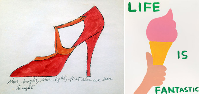 [ 5 ] Mike Dempsey 写了一篇文章 Commercial and fine art: Never the twain shall meet. 讨论了商业艺术家和美术家之间的关系,两者之间的角色是否能相互跨越。在英国到了 1960 年代“商业艺术家”(commercial artist)才逐渐转变成“平面设计师”(graphic designer),Mike Dempsey 认为虽然平面设计师这个称呼更受尊敬和正式,但是商业艺术家更符合他们所做的,他认为从商业艺术家转到正经的美术家是很难跨越的,列举了一些例子。Andy Warhol 他是从商业艺术家开始的,上面的鞋子广告更多图片可以见这,与之相反,从美术家闯到商业艺术家到没有什么问题,因为它们总是以美术家的作品去展示和推销,如上图右的 David Shrigley 为 2016 Rio Olympics 设计的海报,看着就像业余平面设计师的作品(我看着很喜欢)。