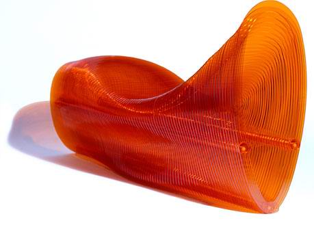 Slice Chaise由Mathias Bengtsson设计,激光切割成型。用3根拉紧的尼龙绳将众多的切片组合而成,用简单的方法将2维变成3维的,而且透明的聚丙烯酸,鲜亮的颜色带着一点未来主义的色彩。via:MoCo Loco