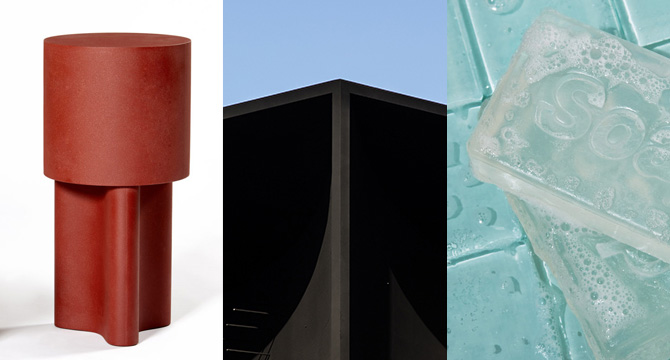 [ 12 ] 几种颜色和材料。François Bauchet 的一组作品,材料使用沙子、树脂和混凝土做成,上图左为一组红色。混凝土之类的材料通常被用来强调材质的原始性,粗粝,不加雕饰,通常表达的是精致的对立面,而 Apple Park 上对混凝土的使用,启发我们是否也可以去表达原始粗粝的对立面? /// 上图中是 Asif Khan 为现代集团在平昌冬奥会设计的展馆,使用了 Vantablack VBx2 材料(可以吸收 99% 的光),被称为是最黑的建筑。 /// 上图右是 Jasper Morrison 为 Good Thing 设计的肥皂,无色素无香味透明,可以一分四来使用。