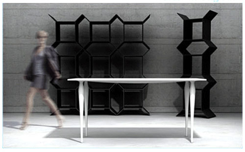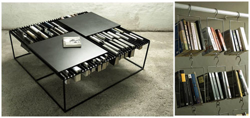 “Nar”咖啡桌(上左),将咖啡桌和书架融到一起,而且用挂的方法来排列安放书籍,不仅节省了空间,而且很方便阅读,因为挂书就为每一本书提供了一个书签,并且可以有效的阻挡灰尘的沉积,而这种方式拉进了书和生活的距离,这个设计获得了Istanbul Design Week 2005 Best Design Award(2005伊斯坦布尔设计周最佳设计奖)。