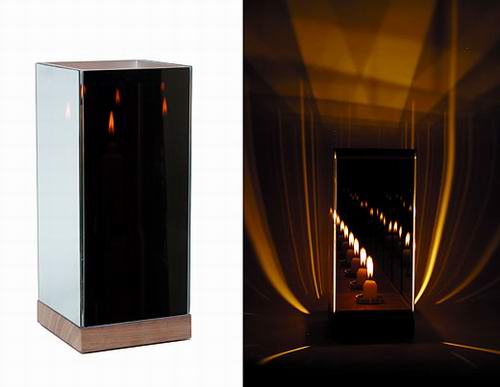 反射是玩弄光效的法宝。这个由 joerg gaetjens设计的”danke ingo”烛台,正是运用了半透明和发射的现象,实际只用单独的蜡烛光来表现丰富的视觉效果。由于蜡烛的四周都是透明的反射玻璃,所以能够出现无数的反射光像,而且这种效果随着环境光的变化而变化,比如夜晚你将看得更清楚,也可以看到更多的灯光,而环境光较强时,比如白天,你就只能看到悬浮着的火焰。
