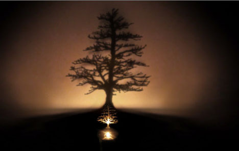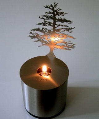 这个Lumen Tree由探索光影的艺术家Adam Frank设计,它是一盏油灯,灯的旁边有用来投影的树形(酸蚀刻而成),将一个树影子投到墙上,而能够提供17小时照明的燃料是无臭洁净的液蜡。(via:MoCo Loco)