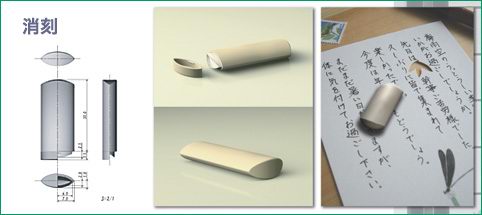 一个很具有东方韵味的现代设计,在这一点上日本是我们需要学习的对象,这是一个类似于橡皮的文具,针对于传统的书写方式(而我们身边已经很少见这种传统的书写方式了,即使喜帖都是用电脑精心制作了),它不仅有橡皮一样的功能,可以消除错误的字迹,但带来的效果不如橡皮一样,留下的是一种不适的改正痕迹(即使视觉上看不到,使用的过程也能体会到),但它却是一种洒脱的方式,而且留下的痕迹(挖空的形状)带给你的是一种和纸面一体的美感,如同“留白”,而外观造型也和它的精神相融一体。